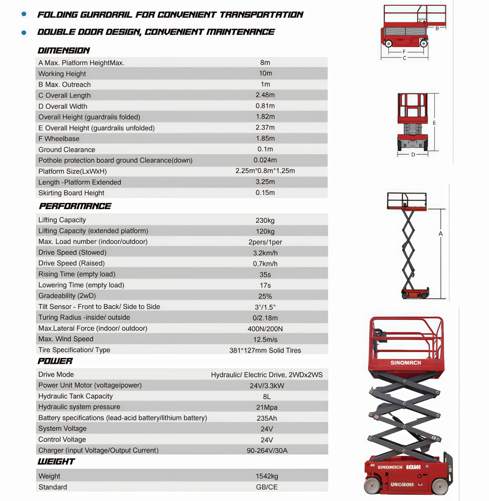 The overall weight of the GKX80E scissor lift may vary depending on optional configurations and different regional standards. Please confirm specifications with your supplier before purchase.